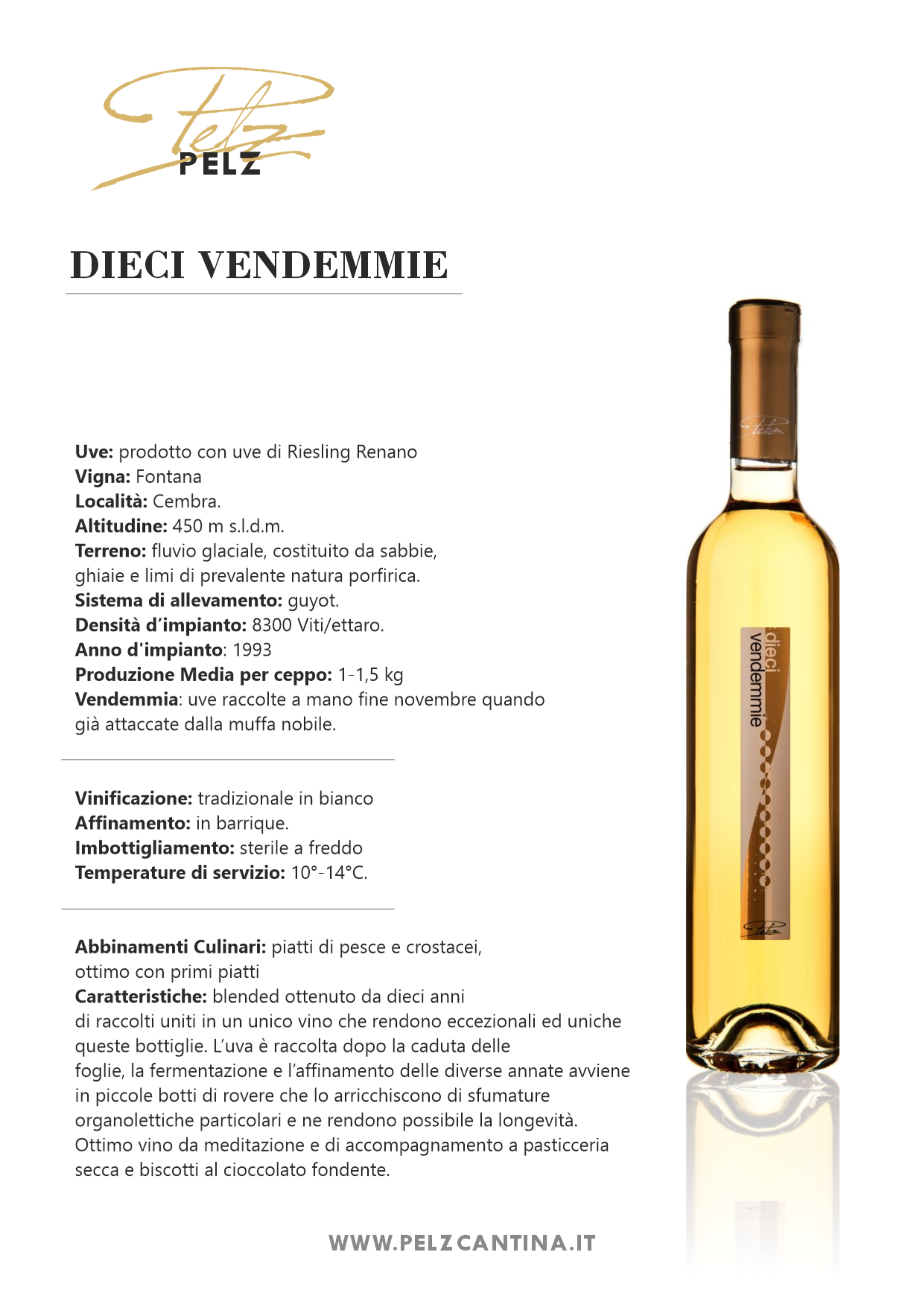 Caratteristiche: blended ottenuto da dieci anni di raccolti uniti in un unico vino che rendono eccezionali ed uniche queste bottiglie. Lʼuva è raccolta dopo la caduta delle foglie, la fermentazione e lʼaffinamento delle diverse annate avviene in piccole botti di rovere che lo arricchiscono di sfumature organolettiche particolari e ne rendono possibile la longevità. Ottimo vino da meditazione e di accompagnamento a pasticceria